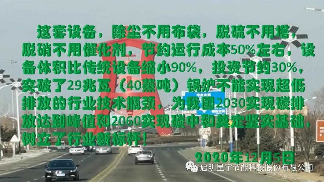 這套設(shè)備,除塵不用布袋,脫硫不用塔,脫硝不用催化劑,節(jié)約運(yùn)行成本50%左右,設(shè)備體積比傳統(tǒng)設(shè)備縮小90%,投資節(jié)約30%,突破了29兆瓦(40蒸噸)鍋爐不能實(shí)現(xiàn)超低排放的行業(yè)技術(shù)瓶頸,為我國(guó)2030實(shí)現(xiàn)碳排放達(dá)到峰值和2060實(shí)現(xiàn)碳中和奠定堅(jiān)實(shí)基礎(chǔ),樹(shù)立了行業(yè)新標(biāo)桿!