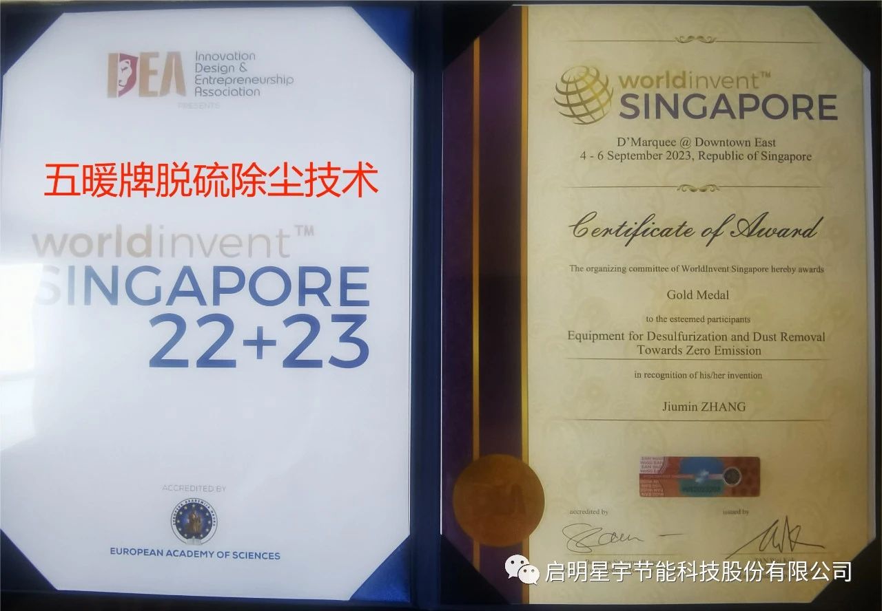 2023年9月新加坡國際發(fā)明展覽會,授予五暖牌脫硫除塵脫硝一體化設(shè)備《全球原創(chuàng)發(fā)明獎》,是對啟明星宇10年研發(fā)成果的肯定,同時,體現(xiàn)出為全人類服務(wù)的能力和價值,專利技術(shù)轉(zhuǎn)化產(chǎn)品,全球原創(chuàng)唯一性,企業(yè)品牌得到進一步提升!