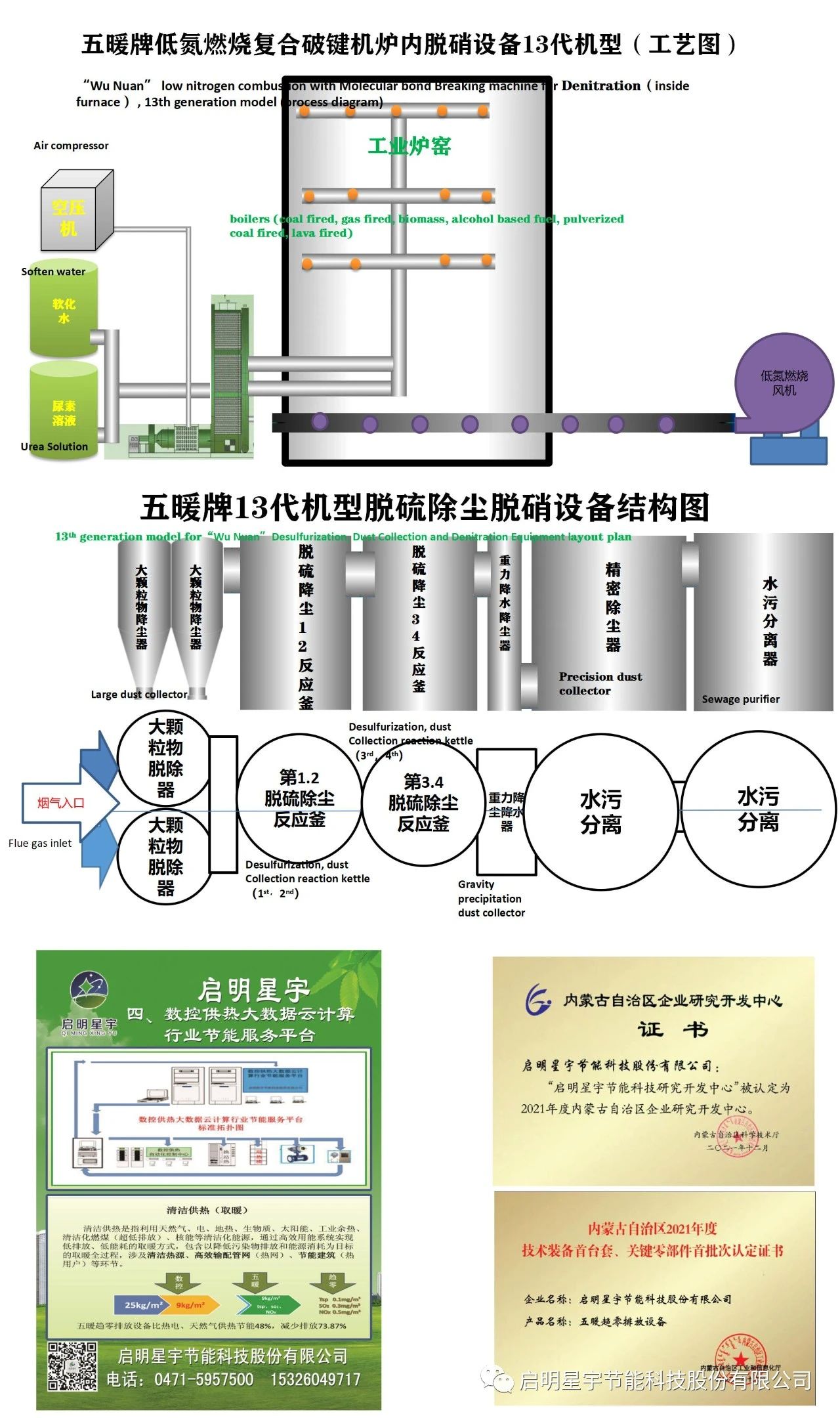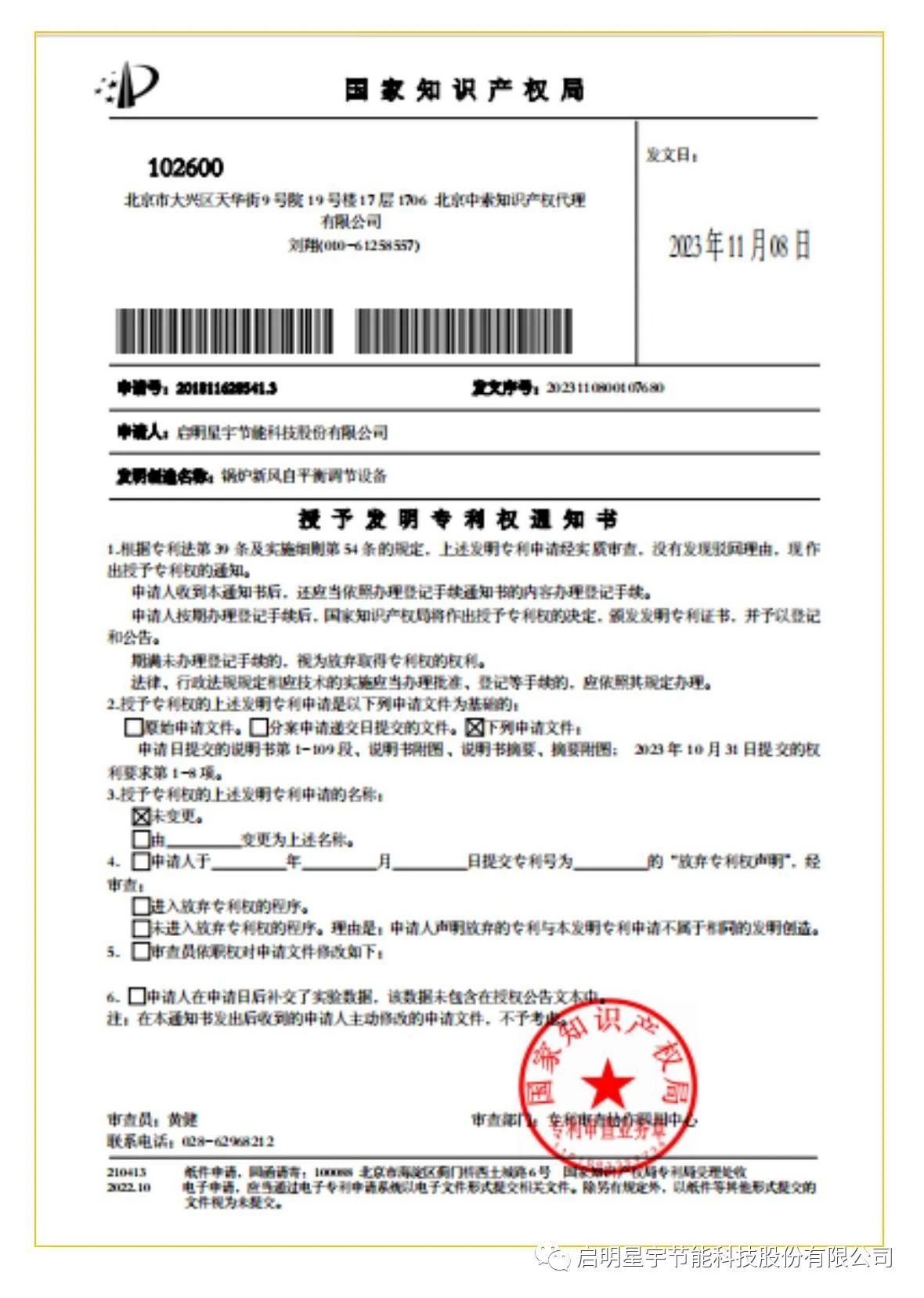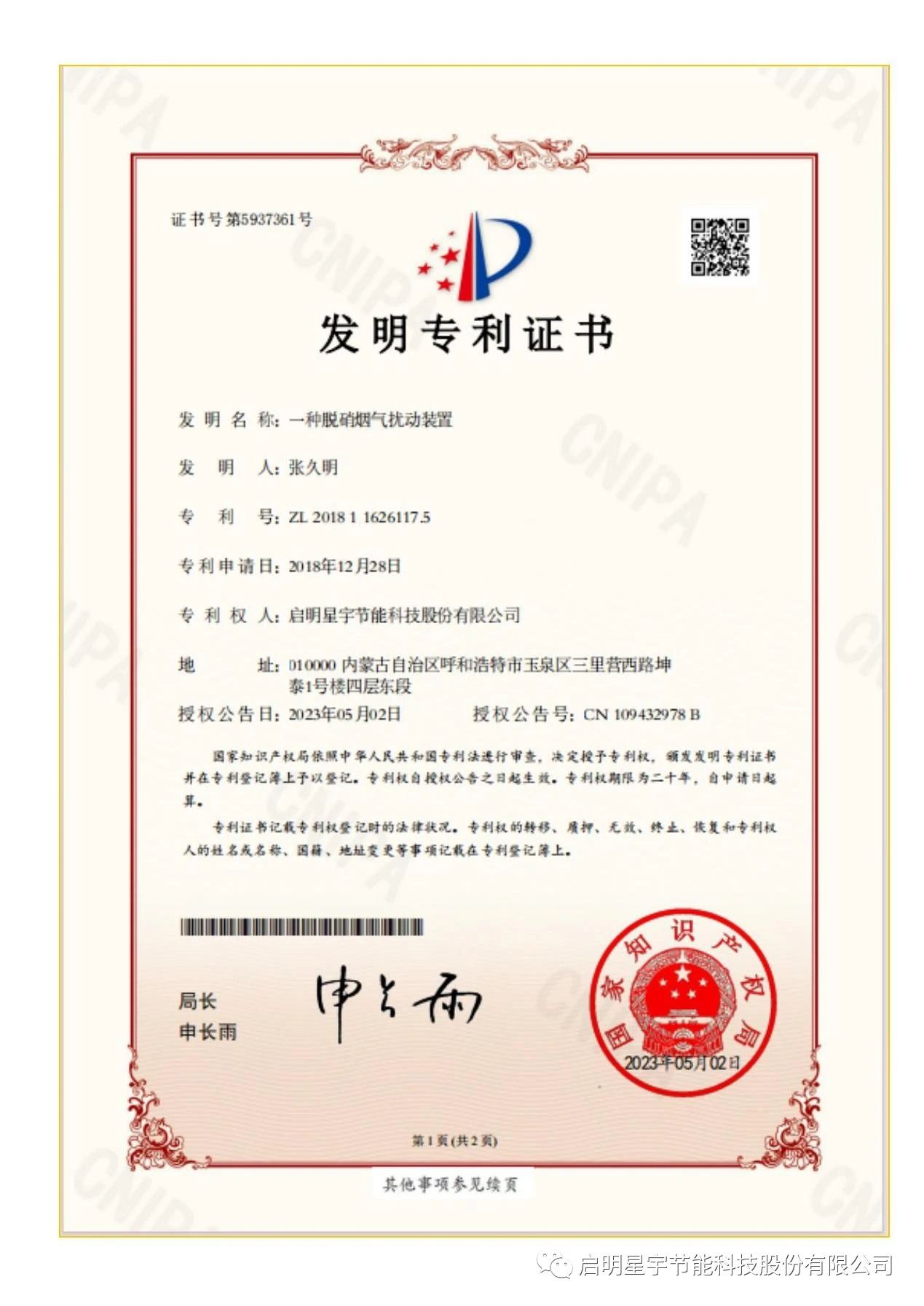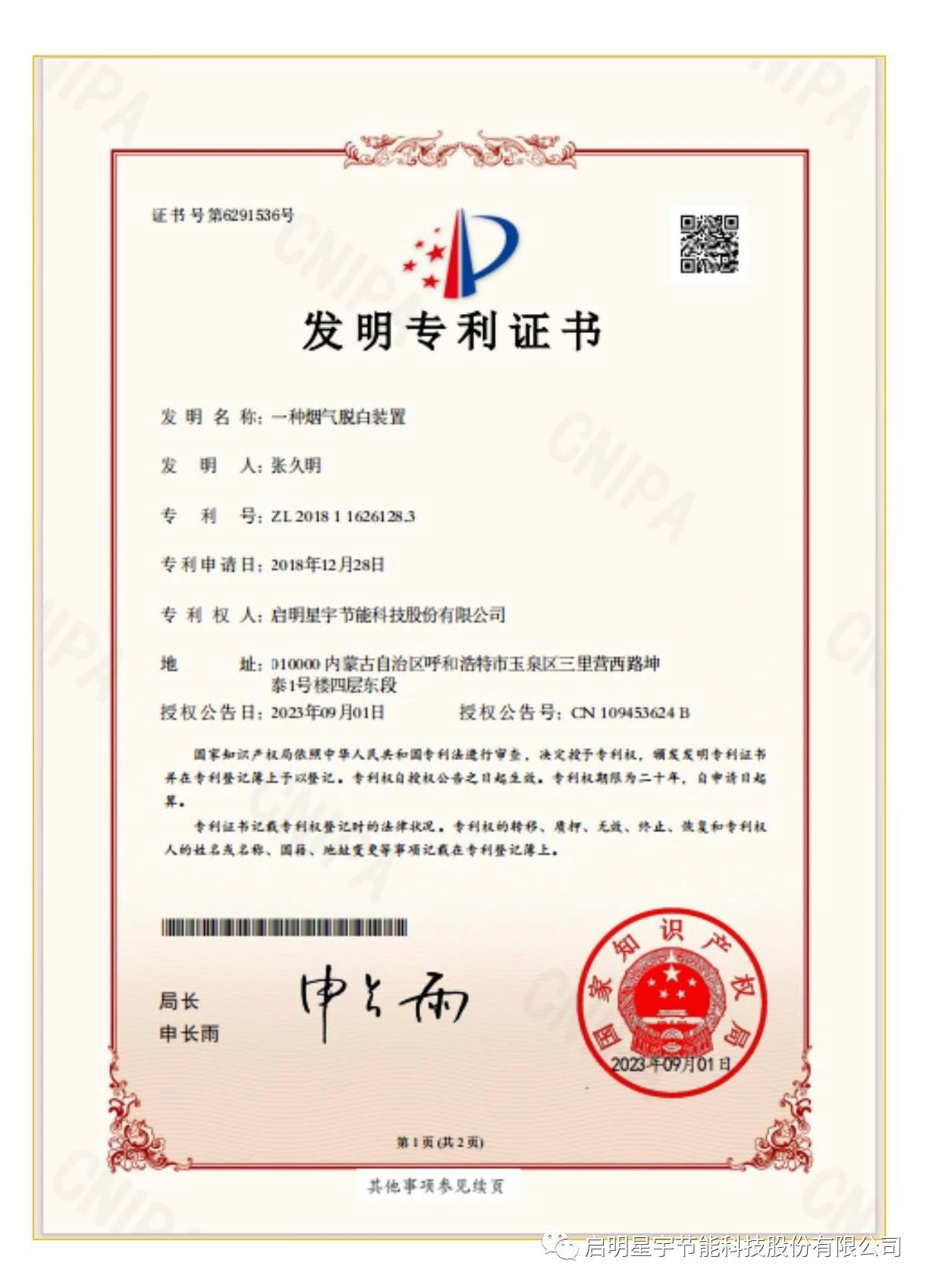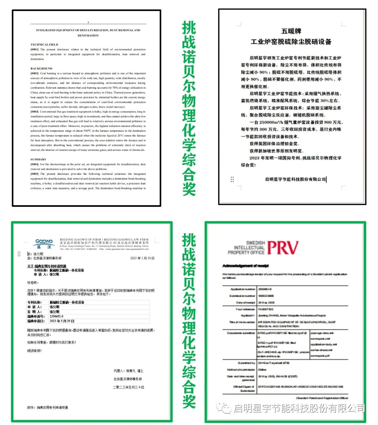 2023年11月8日啟明星宇收到國家知識產(chǎn)權(quán)局,三項發(fā)明專利授權(quán)通知書,今年連續(xù)授權(quán)發(fā)明專利6項。我們研發(fā)的五暖牌工業(yè)爐窯脫硫除塵脫硝設(shè)備,除塵不用布袋,體積比傳統(tǒng)布袋除塵減小90%;脫硫不用脫硫塔,比傳統(tǒng)脫硫塔體積減小90%,脫硝不要催化劑,藥劑使用減小90%,不用更換催化劑。