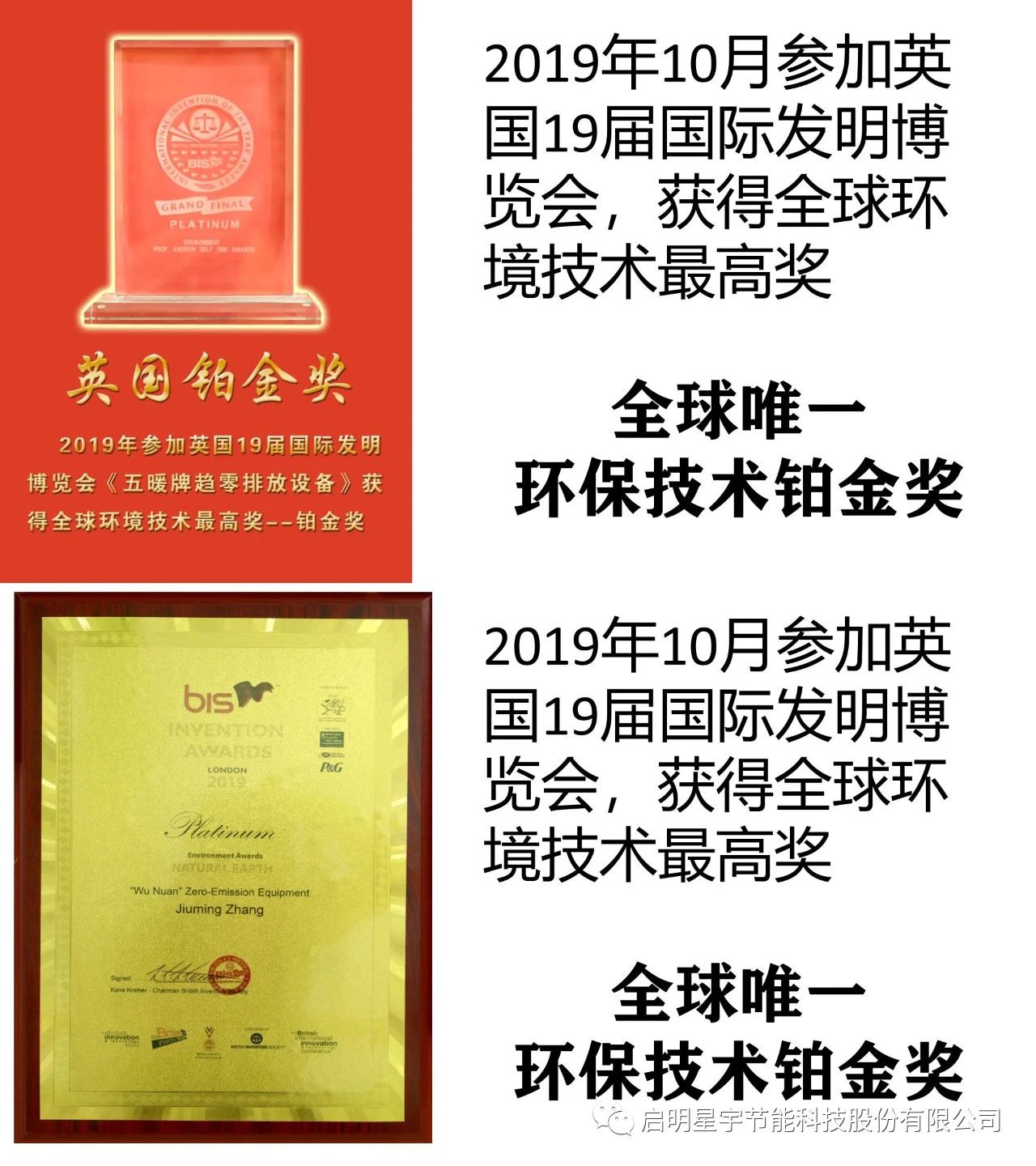 2019年10月參加英國19屆國際發(fā)明博覽會,獲得全球環(huán)境技術(shù)最高獎---鉑金獎,同時獲得雙金獎!